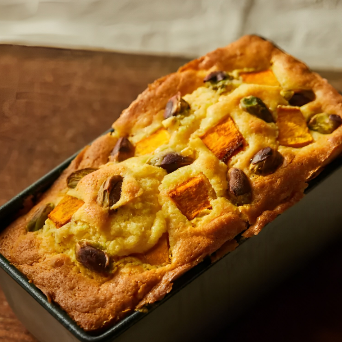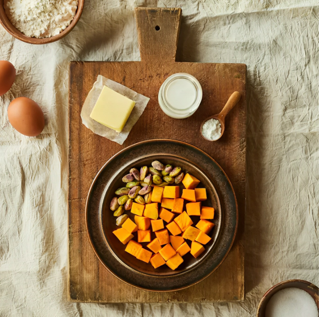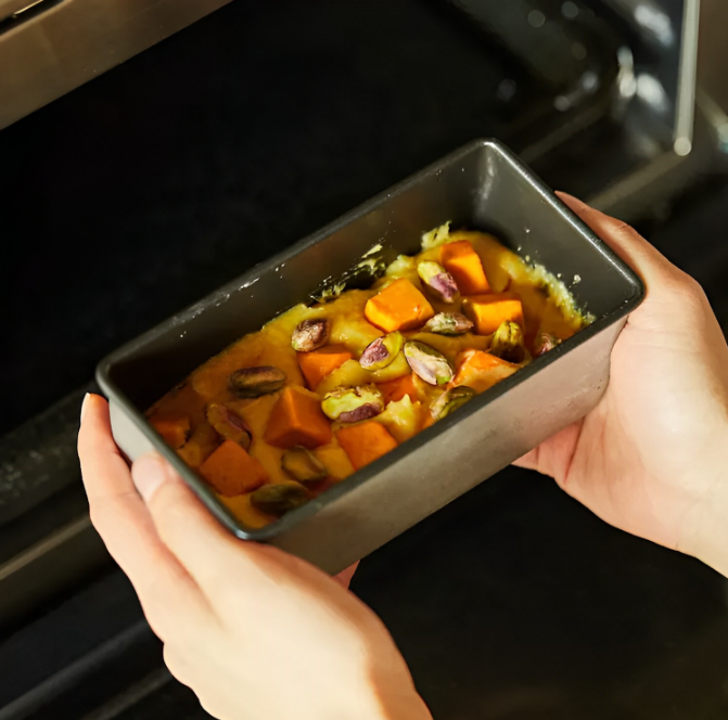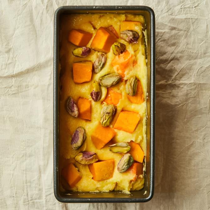 Bước 3: Đổ bột vào khuôn, sau đó cho bí đỏ và hạt dẻ cười lên trên. Vỗ mạnh khuôn xuống 3-4 lần để loại bỏ bọt khí và làm phẳng bề mặt.