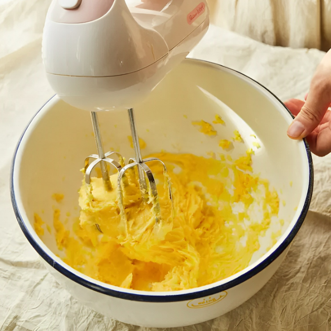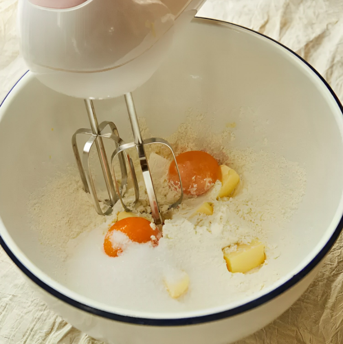 Bước 1: Rây bột mì và bột nở vào tô, tiếp đến thêm bơ, đường, lòng đỏ trứng và kem tươi dùng máy đánh trứng, đánh đều.